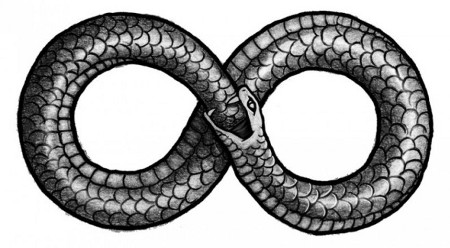 «Tendremos entonces una guerra entre la conciencia y la naturaleza, entre el deseo de permanencia y el hecho del flujo. Esta guerra debe ser totalmente fútil y frustrante —un círculo vicioso— porque es un conflicto entre dos partes de la misma cosa. Debe conducir al pensamiento y la acción en unos círculos cada vez más rápidos que no van a ninguna parte, pues cuando dejamos de ver que nuestra vida es cambio, nos enfrentamos a nosotros mismos y nos volvemos como Ouroboros, la serpiente desorientada, que trata de morderse su propia cola. Ouroboros es el símbolo perenne de todos los círculos viciosos, de todo intento de dividir nuestro ser y hacer que una parte conquiste a la otra.